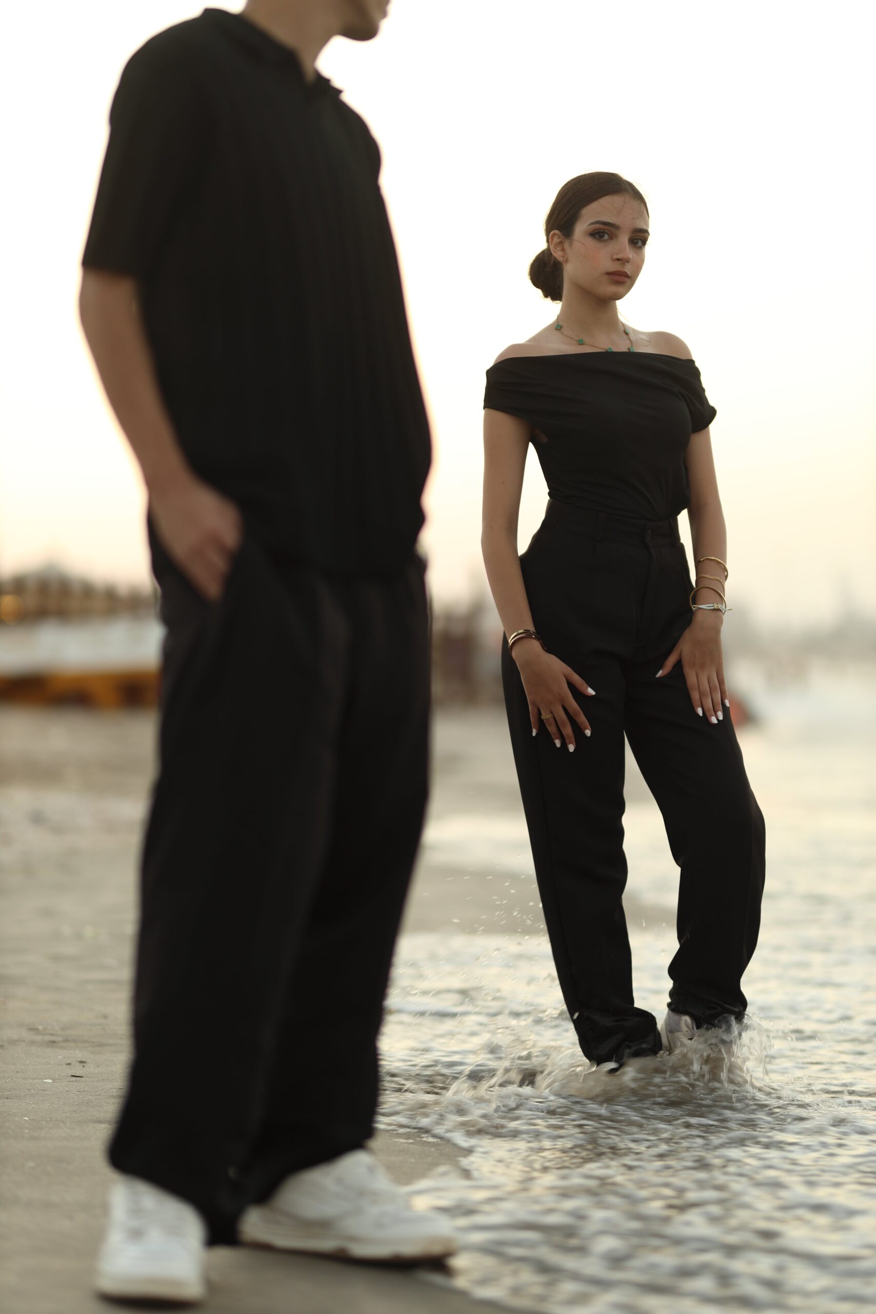 These are high-waisted, straight-leg black trousers. The fabric appears to be a lightweight cotton or a similar blend, with a subtle texture. The pants have a simple, clean design with a front button and zipper closure, and are styled with a solid-colored top and white sneakers. The fit is relaxed yet tailored, making them versatile for both casual and semi-formal wear.